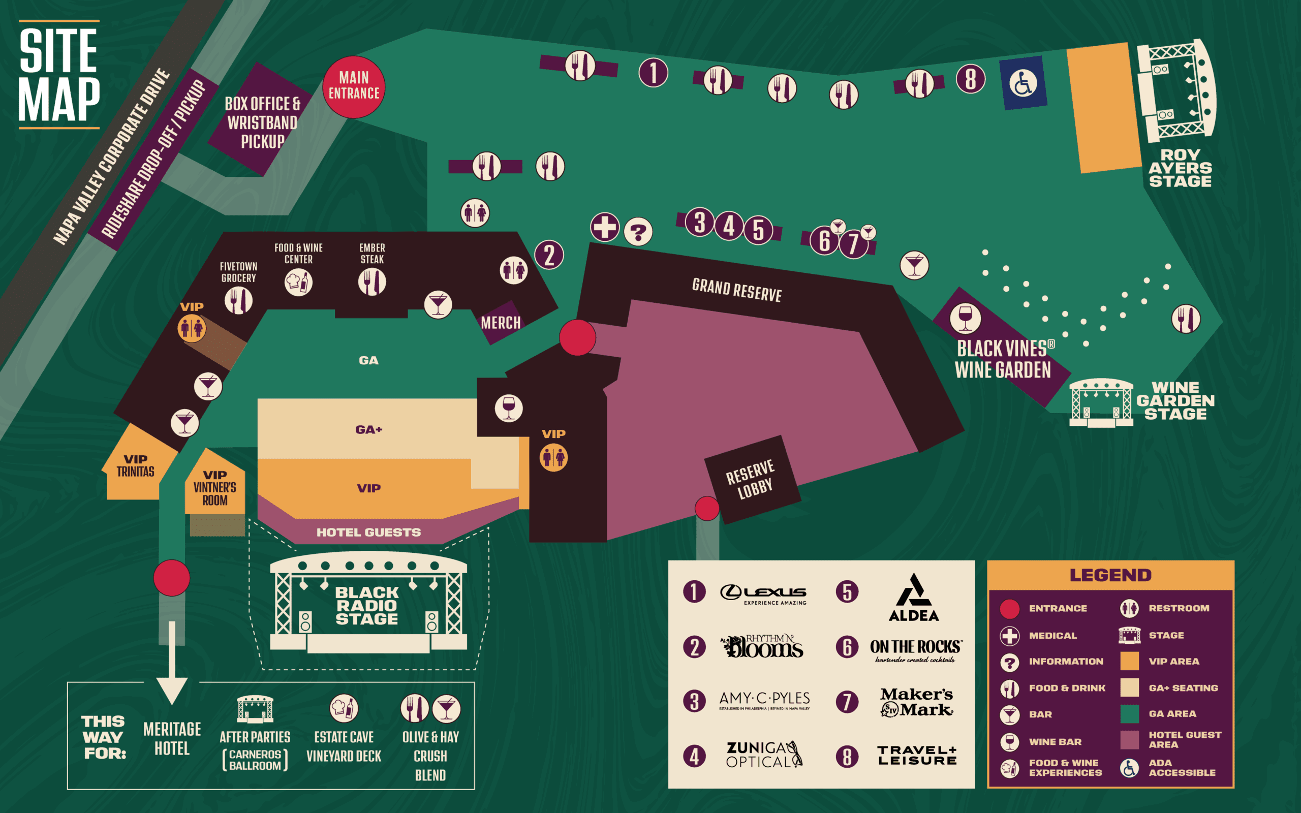 The festival is located at the Meritage Resort & Spa, located at 875 Bordeaux Way in Napa, CA. View the festival map below to see entrance locations and more. There are a few events happening in the Napa Valley this weekend. If you’re driving from San Francisco, anticipate some heavy traffic. We recommend taking I-80 East for the fastest route.