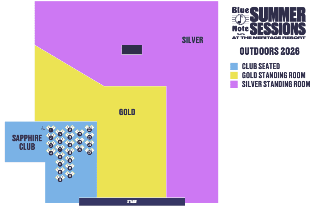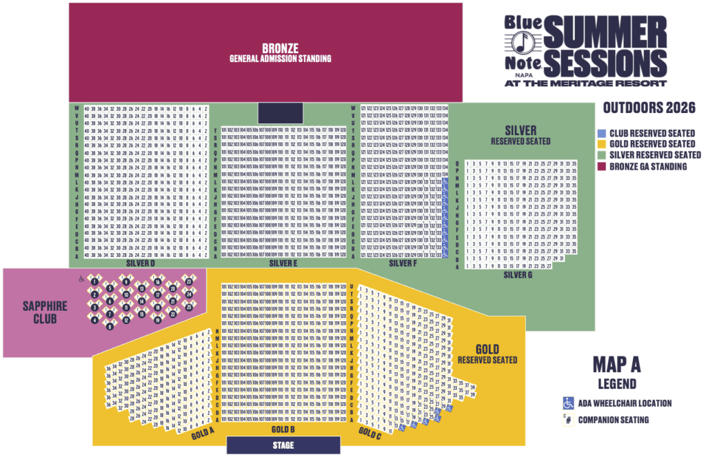 All events are fully accessible. Accessible tickets are available for all events at the Blue Note Napa Summer Sessions. An usher will be available at the event to assist with finding your seat. See below for accessibility info. For specific questions, contact our box office at boxoffice@bluenotenapa.com